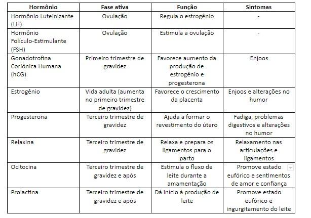 Há pelo menos oito tipos de hormônios que são dignos de menção quando se trata de avaliar os impactos na gravidez e no período de amamentação. Confira na tabela abaixo quais são eles e de que maneira impactam no organismo.
