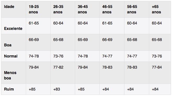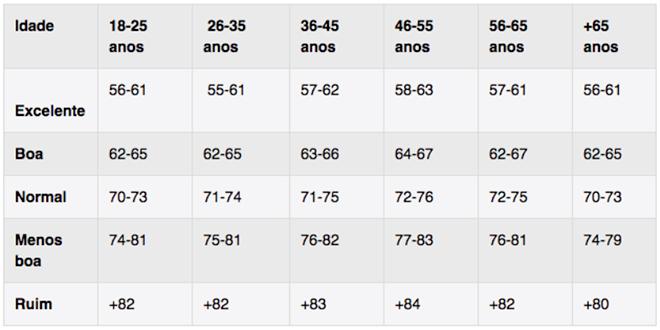 Seguindo as orientações de frequência cardíaca mínima e máxima, chegamos a um tabela aproximada da frequência cardíaca normal em repouso, para homens e mulheres, de acordo com a faixa etária.